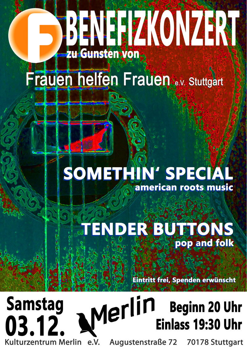 Ein Abend, zwei Bands und ein Saal voller lieber Menschen: am Samstag, den 03. Dezember 2016 brachten SOMETHIN‘ SPECIAL und TENDER BUTTONS ein abwechslungsreiches, musikalisches Programm zugunsten von Frauen helfen Frauen e.V. auf die Bühne. Wir bedanken uns ganz herzlich bei allen Mitwirkenden für ihr außerordentliches Engagement an diesem wundervollen Abend. Hier geht es zum ausführlichen Bericht.