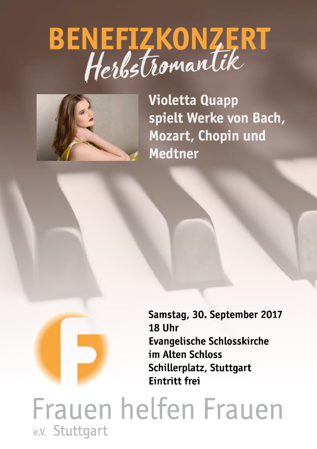 Hier finden Sie einen Bericht zum Benefizkonzert am Sa, 30. September 2017 in der Ev. Schlosskirche im Alten Schloss Stuttgart, wo die Pianistin Violetta Quapp mit Werken von Bach Mozart, Chopin und Medtner die zahlreich erschienenen Zuhörerinnen zu Gunsten der Arbeit von Frauen helfen Frauen e.V. begeisterte.